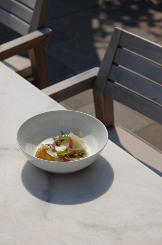 For the cauliflower cream, cook the rest of the cauliflower in salted water with a bit of lemon until soft. Blend the softened cauliflower with a little brown butter - or margarine as a vegan alternative - and season with salt and pepper.