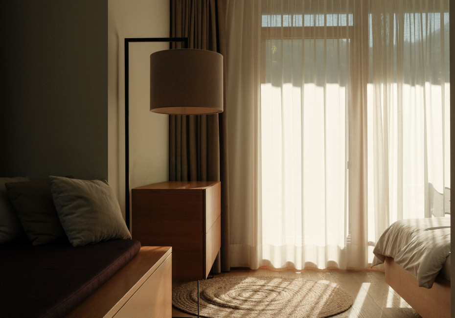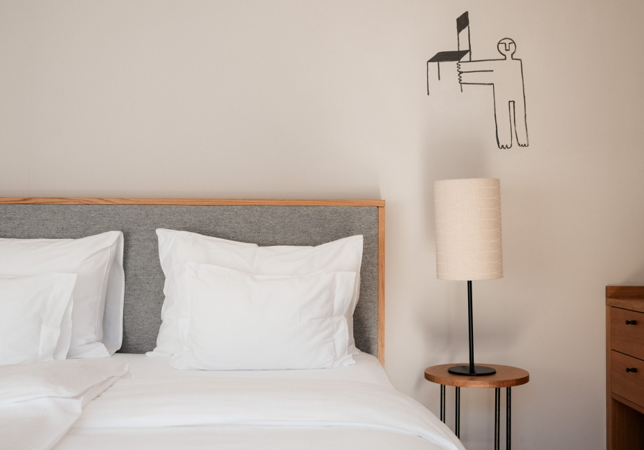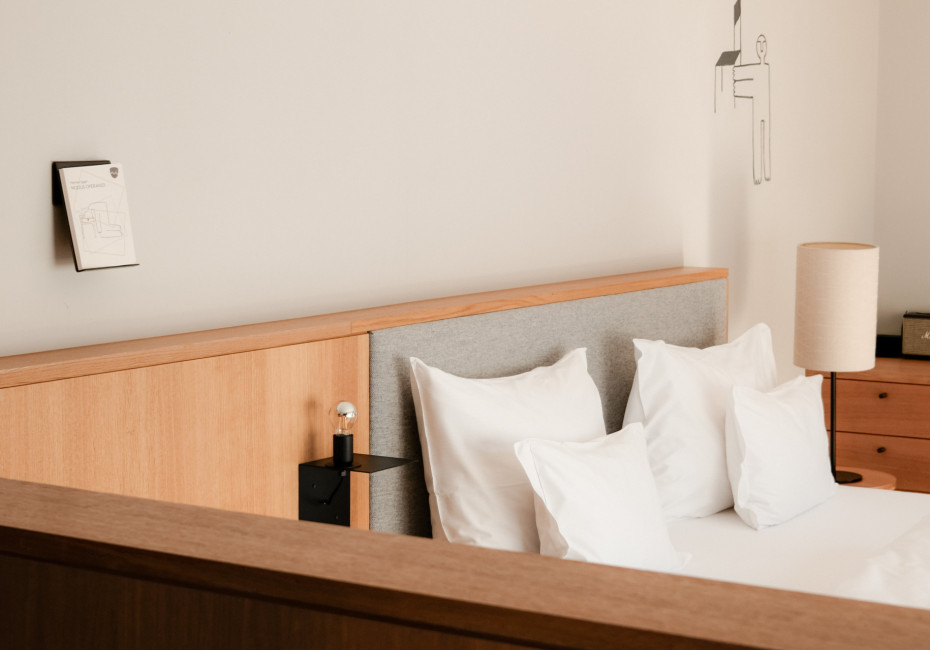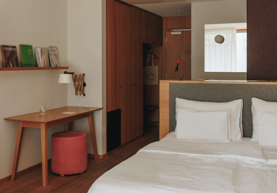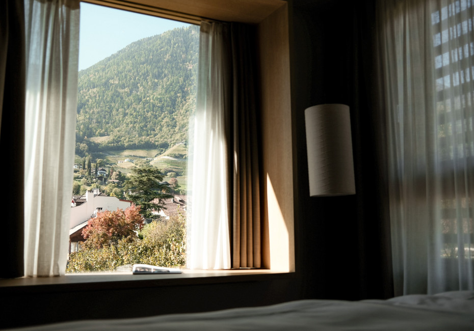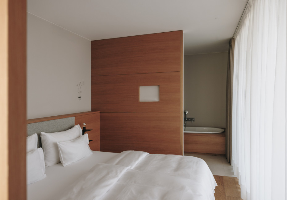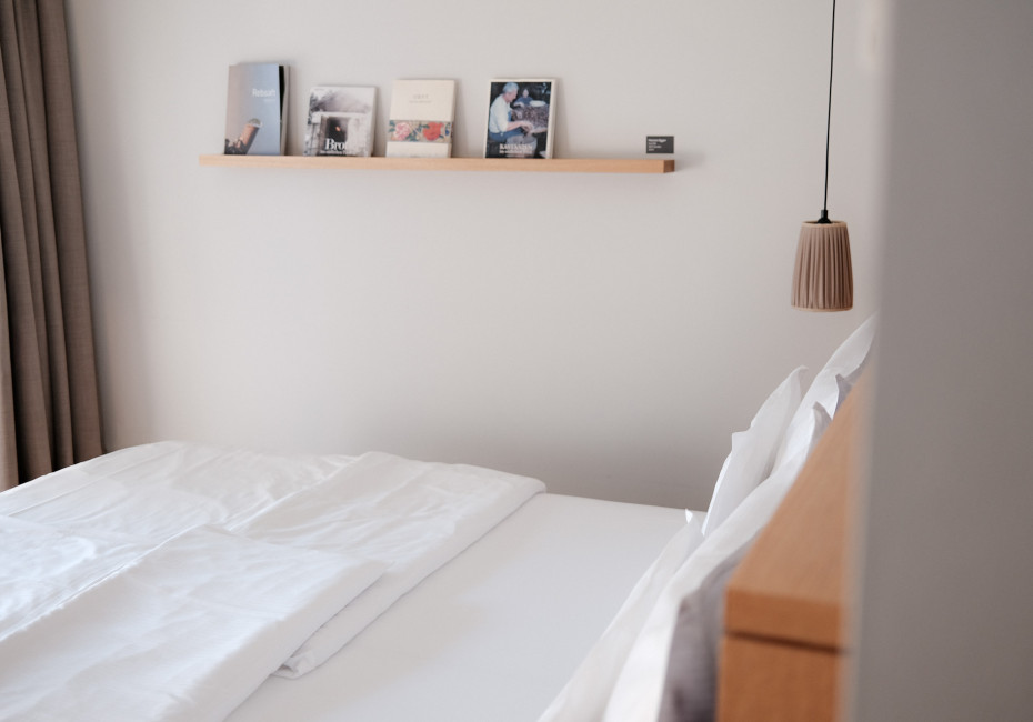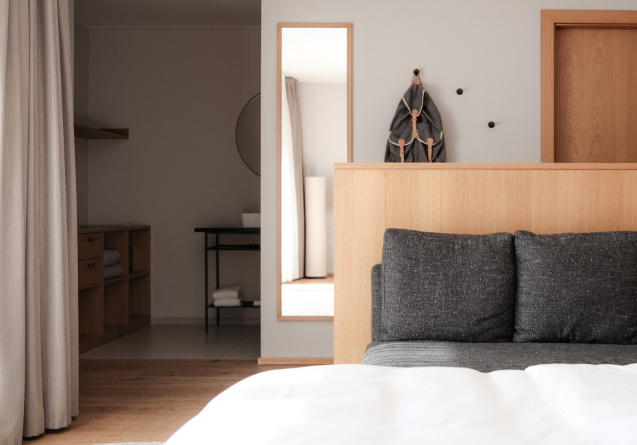 Le eleganti e confortevoli camere doppie e situate nel nuovo tratto giardino, sono arredate principalmente con materiali naturali e hanno un grande balcone rivolto verso sud. I pavimenti sono in legno di quercia e i bagni sono parzialmente aperti. Nelle camere è stata allestita una piccola biblioteca, opera d’arte dell’artista Hannes Egger.