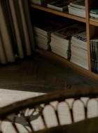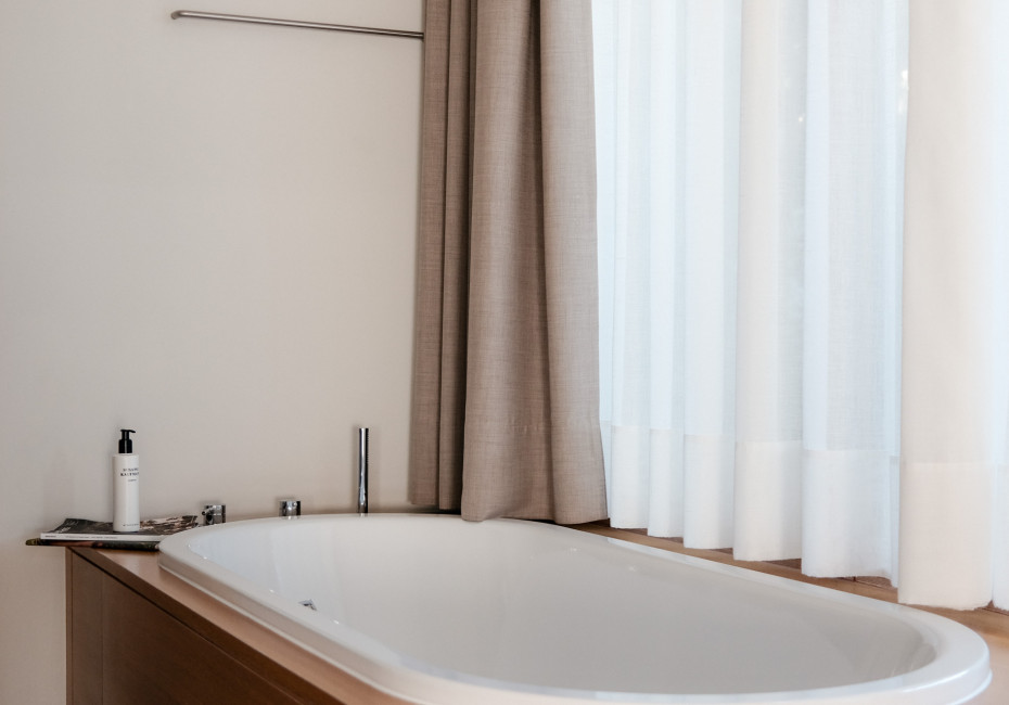 L’elegante suite nel tratto giardino con vetrata su tre lati ha una confortevole disposizione degli spazi e un grande balcone rivolto verso sud. I pavimenti sono in legno di quercia e i bagni sono parzialmente aperti. Nelle camere è stata allestita una piccola biblioteca, opera d’arte dell’artista Hannes Egger.