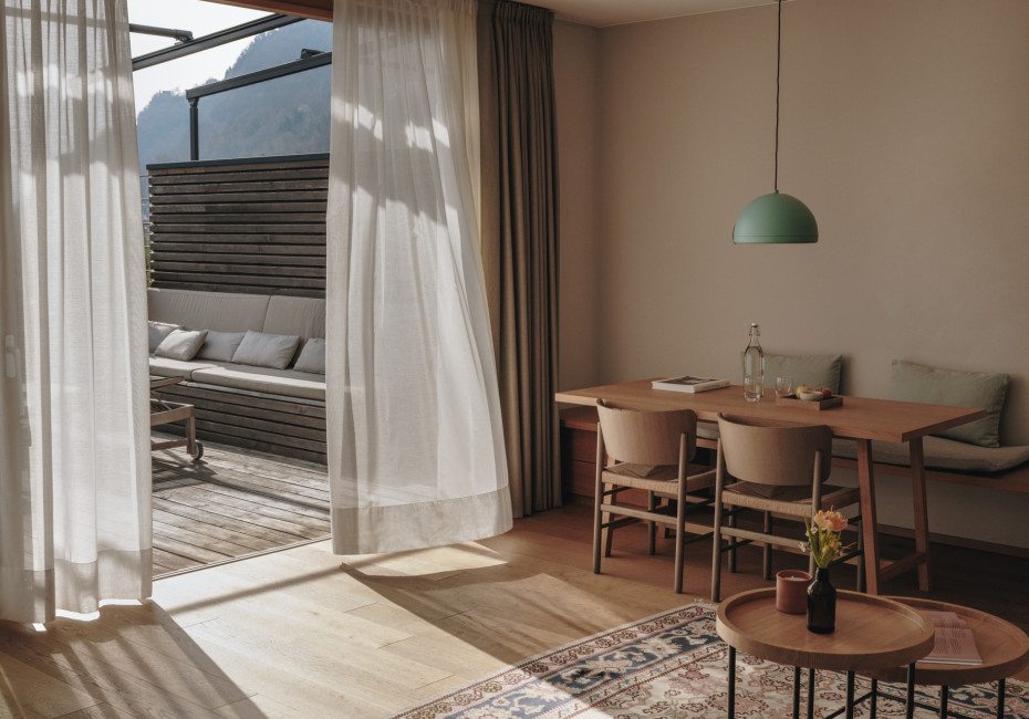 L’elegante e minimalistica Garden Suite Deluxe con vetrata su tre lati ha una confortevole disposizione degli spazi, una grande terrazza rivolta verso sud, una pergola privata e un giardino di 65 m². I pavimenti sono in legno di quercia e i bagni sono parzialmente aperti. Nelle camere è stata allestita una piccola biblioteca, opera d’arte dell’artista Hannes Egger.