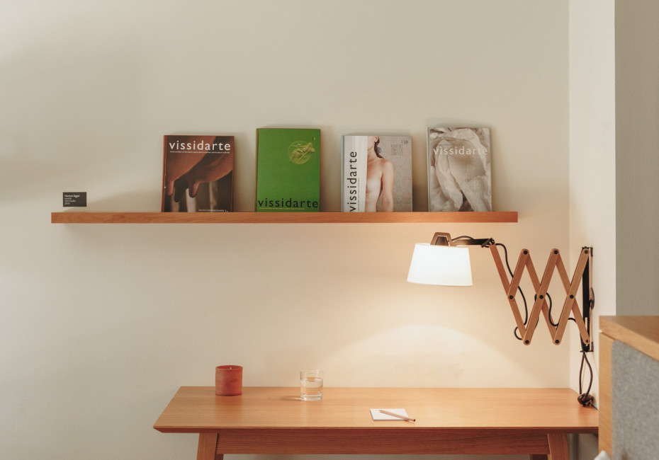 L’elegante suite nella casa principale con vetrata su tre lati ha una confortevole disposizione degli spazi e un grande balcone rivolto verso est. I pavimenti sono in legno di quercia e i bagni sono parzialmente aperti. Nelle camere è stata allestita una piccola biblioteca, opera d’arte dell’artista Hannes Egger.