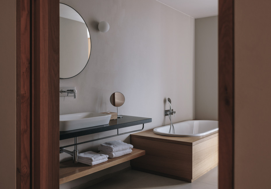 L’elegante suite nella casa principale con vetrata su tre lati ha una confortevole disposizione degli spazi e una grande terrazza rivolta verso sud. I pavimenti sono in legno di quercia e i bagni sono parzialmente aperti. Nelle camere è stata allestita una piccola biblioteca e opere d’arte dell’artista Hannes Egger.